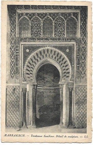 Cette ancienne carte postale montre un détail de sculpture sur les Tombeaux Saadiens à Marrakech, Maroc. Plus précisément, c'est une vue du mihrab (niche de prière) dans la Salle du Mihrab, qui fait partie des trois salles principales du mausolée occidental.